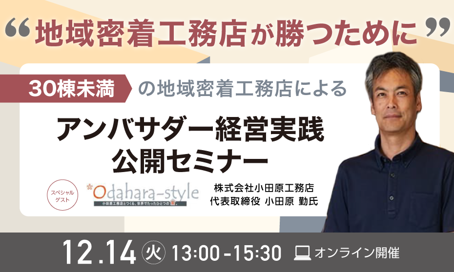 当日は、実際に地域密着工務店の経営者として著名な小田原社長にご登壇いただき、戦略や具体的な取組事例を語っていただきます。また、小田原社長の講演を受けて、弊社の小平から「アンバサダー経営」についての具体的な取組についてお伝えいたします。