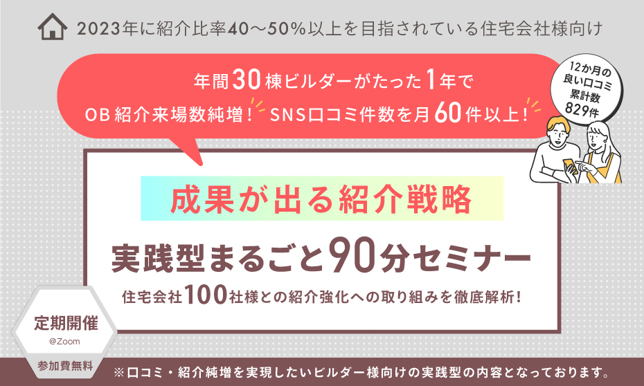 10棟未満の工務店様から1000棟以上のビルダー様まで、規模も業態(注文・建売など)も様々な住宅会社様100社様の紹介強化の取り組みを徹底分析し、みえてきた勝ちパターンを限定公開いたします。