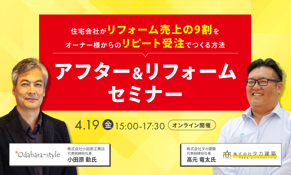 小田原工務店 小田原社長とタカ建築 高元社長に、紹介やリフォーム受注を増やすために工夫していることや意識していることをお話していただきます。